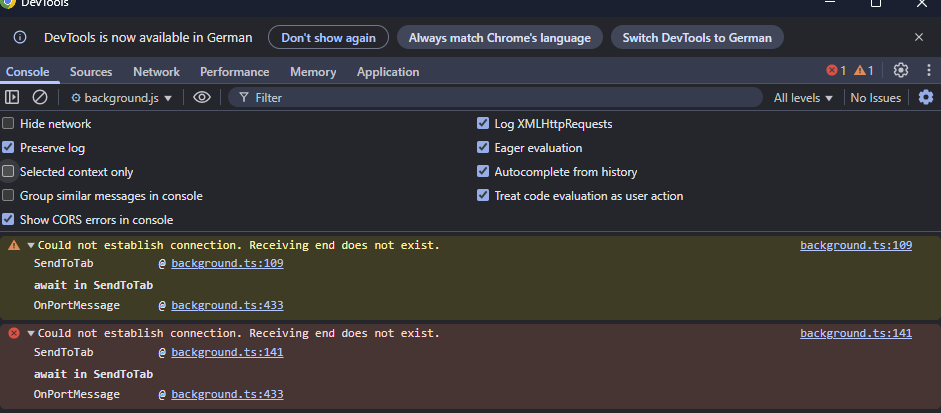 - [14:56:05.072][Error] “Could not establish connection. Receiving end does not exist.”