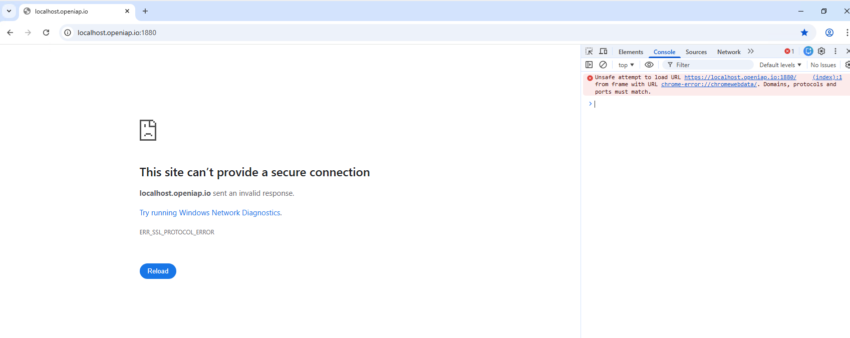 You cannot use HTTPS for localhost.openiap.io. You need to configure Node-RED to use HTTP (or change the URL in the browser and remove the ‘S’ in HTTPS).